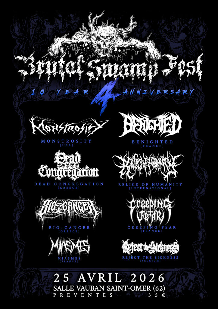 The darkest and the heaviest… C’est ce que ce groupe international de Brutal Death Metal compte vous faire vivre lors de leur passage au Brutal Swamp Fest 4 ! Violence implacable, blasts effrenés, riffs dissonants, growls et gutturaux puissants soutenant cette atmosphère la plus noire, vous l’aurez bien compris, ils ne seront pas là pour plaisanter ! Allez écouter leur dernier album « Absolute Dismal Domain » sorti en janvier 2025 chez Willowtip Records pour vous faire votre idée ![]()